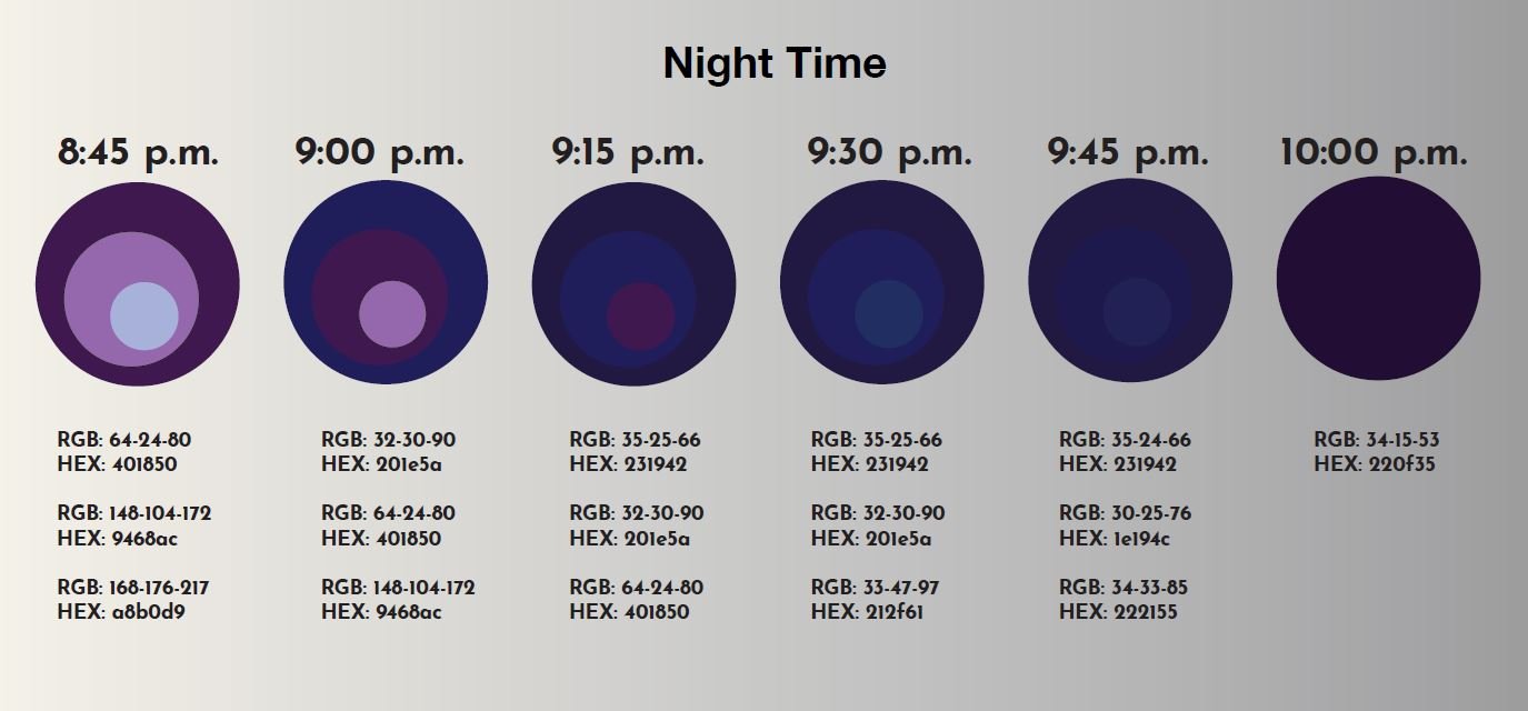 During the night, the LEDs emit warm blue hues. The blues mimic the blue tone of night while using warm blues to encourage relaxation and sleep.